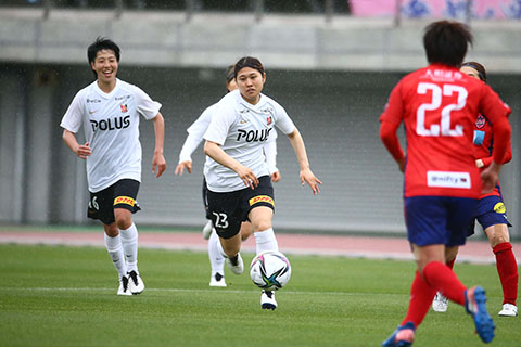 試合は開始早々に動く。水谷が前線に送ったボールが相手DFに当たり、そのままゴール。先制点を奪った。これで勢いに乗ったレッズレディースは、細かく丁寧にパスをつないで、ノジマステラ神奈川相模原陣内に攻め込むと、安藤のドリブルから柴田のシュートなど、ビッグチャンスをつくっていく。すると34分。塩越のロングパスを、前線に上がっていた南が落とし、菅澤がダイレクトシュート。これが決まって2-0とリードし前半を終えた。
