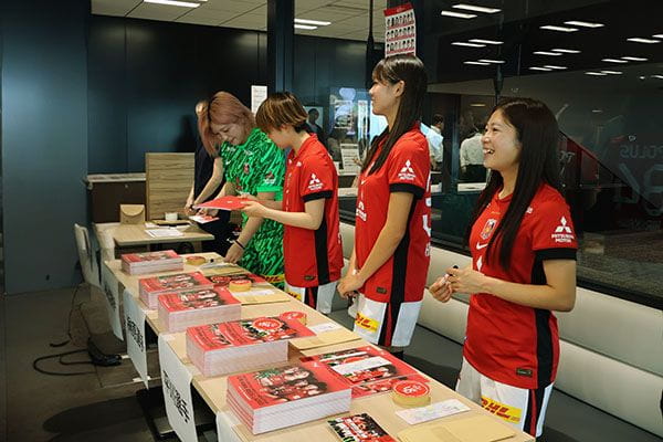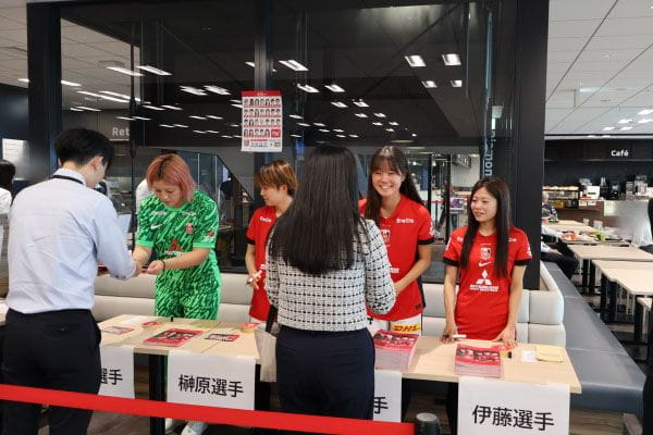 約100名の社員の方々と交流をさせていただき、11月8日(土)に浦和駒場スタジアムで行われますINAC神戸レオネッサ戦や今シーズンの試合の告知をさせていただきました。