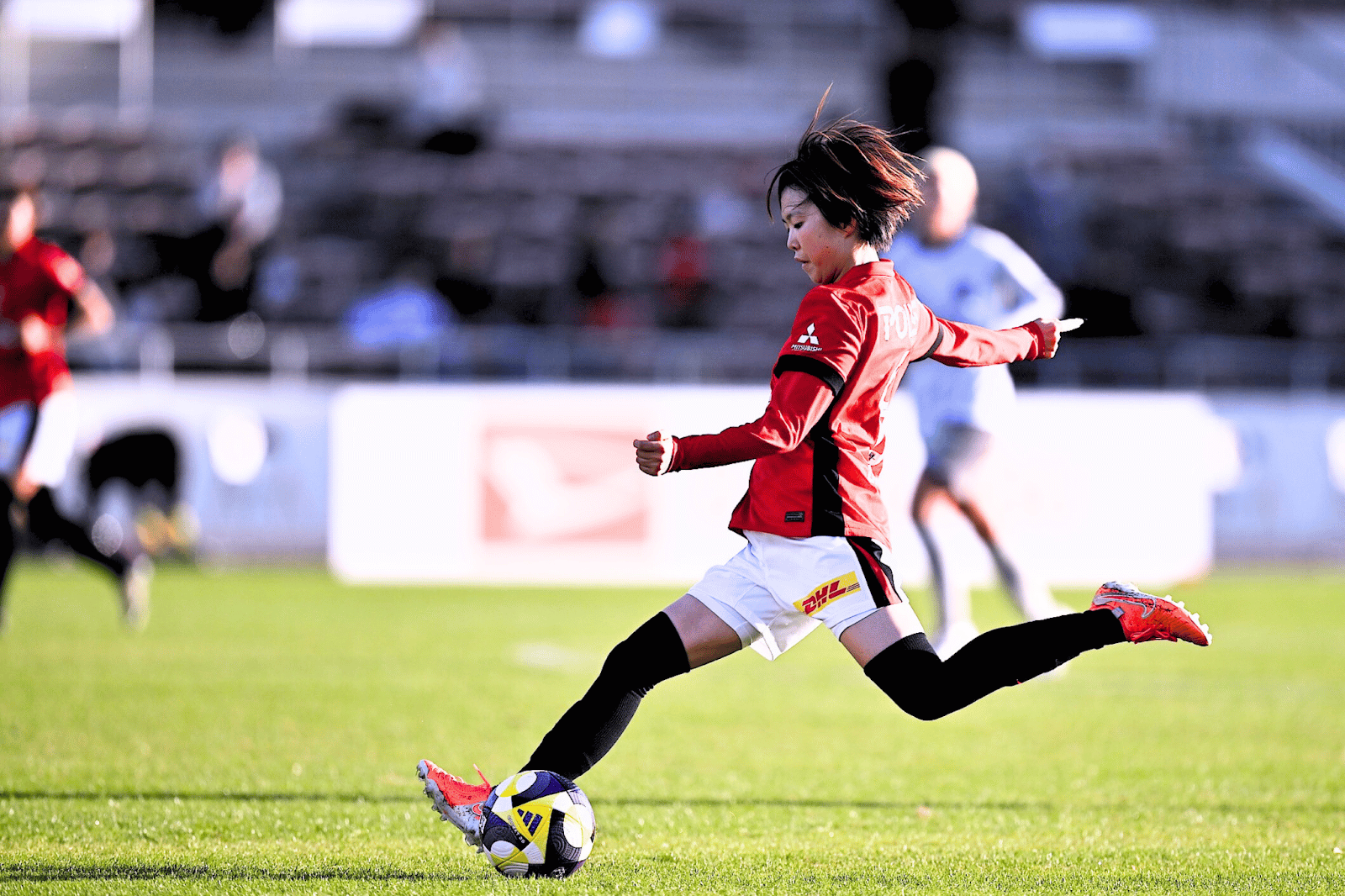 出遅れた相手DFが追いすがろうと反応したことを背中で感じた彼女は、長嶋からの鋭い縦パスを反転して方向転換しながら中に切り返す。