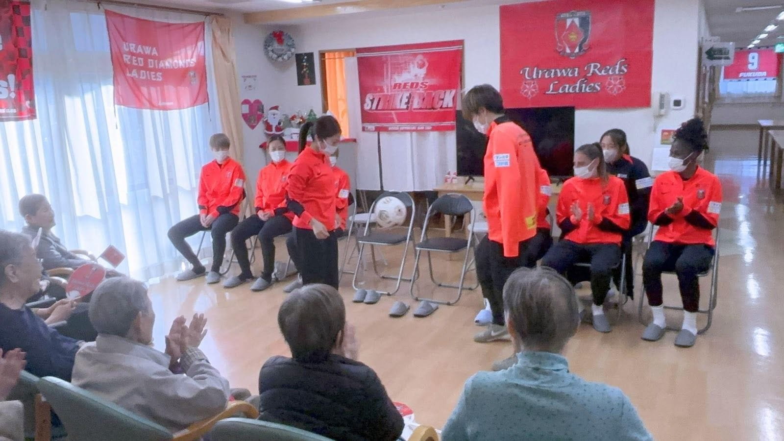 選手たちは、レッズランドのクラブハウスで認知症に関する講座を受講し、その後、2グループに分かれて、「愛の家グループホーム」の南与野事業所と山久保事業所を訪問しました。