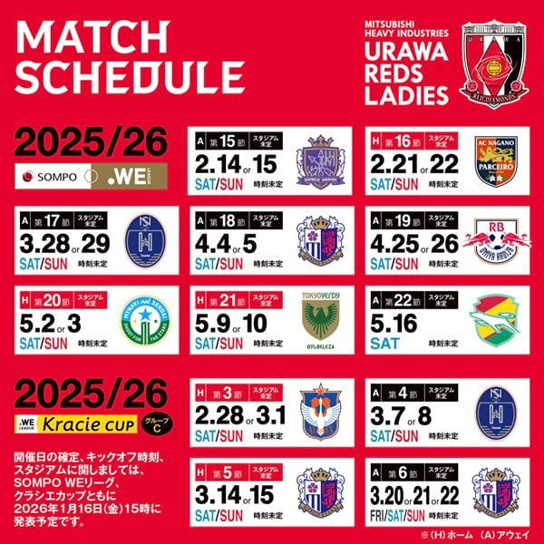 このたび、三菱重工浦和レッズレディースの2025/26 SOMPO WEリーグ 第15節〜第22節対戦カードおよび、2025/26 WEリーグ クラシエカップのグループステージ(第3節〜第6節)の対戦カードが決まりましたので、お知らせいたします。