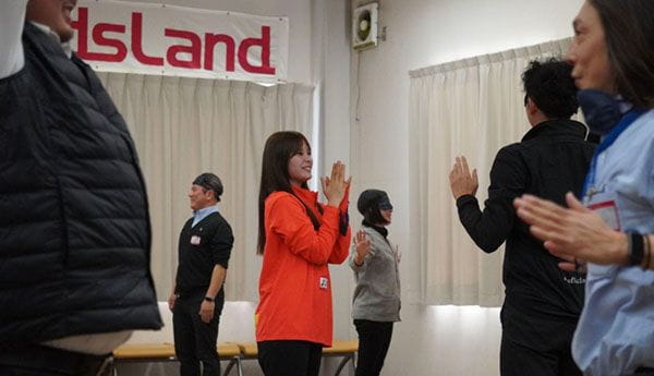 会の中では、講師が行っている体操を、目が見える状況の人が、アイマスクで目が見えない状況となっている人に、口頭でどのような体操をしているかを伝え、再現してもらったり、全員が目の見えない状態の中から、言葉だけで同じ特性を持つメンバーで集まりグループを作ったりするメニューを実施していきました。