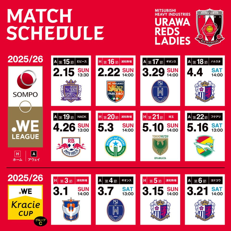 このたび、三菱重工浦和レッズレディースの2025/26 SOMPO WEリーグ 第15節〜第22節および、2025/26 WEリーグ クラシエカップのグループステージ(第3節〜第6節)の日時・会場が決まりましたので、お知らせいたします。