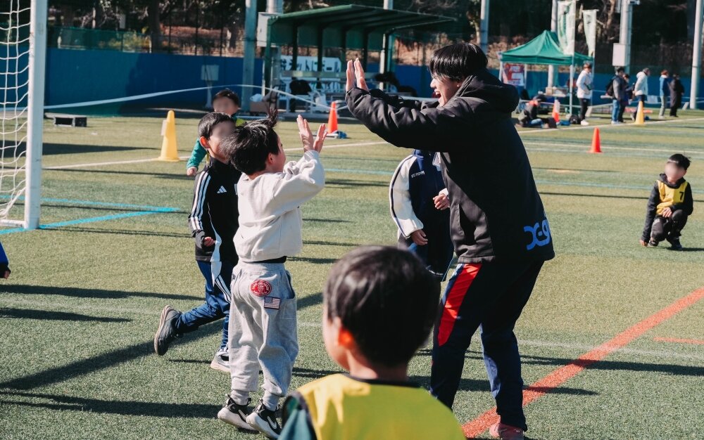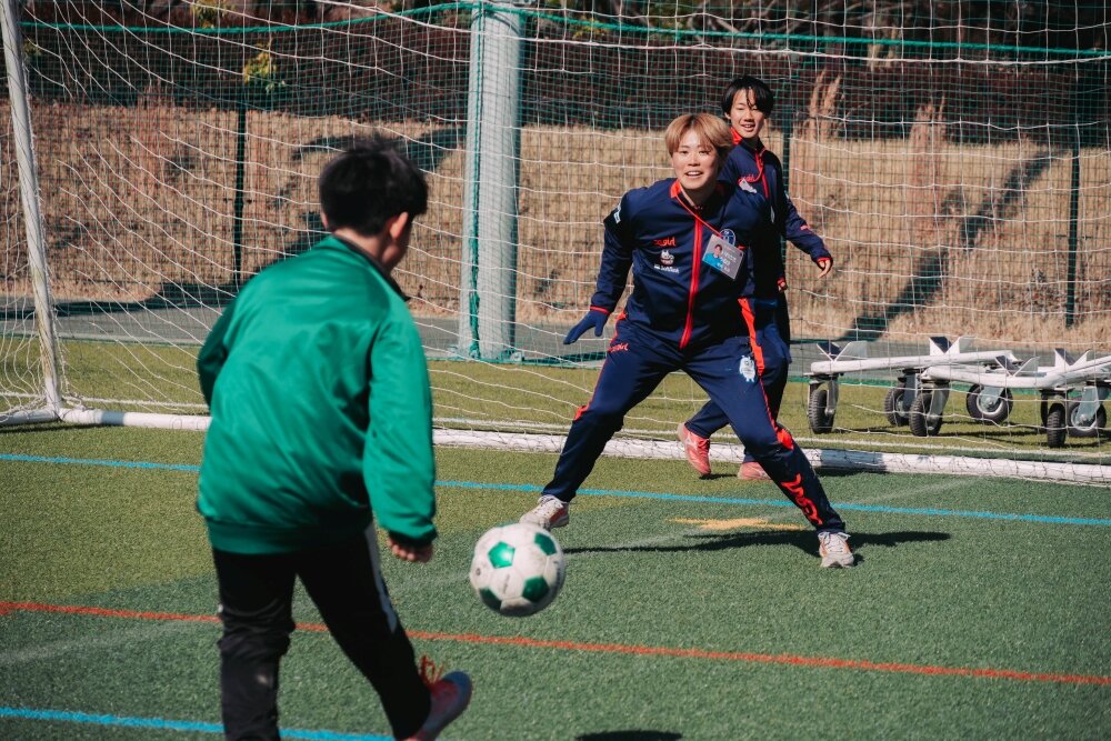 サッカークリニックはSC相模原の普及スタッフの皆さまと合同で行い、小学1年生~6年生を対象に計3コマを開催。学年に合わせた進行で選手も各メニューに加わりながら、約100名の子どもたちとサッカーを通じた交流を深めました。