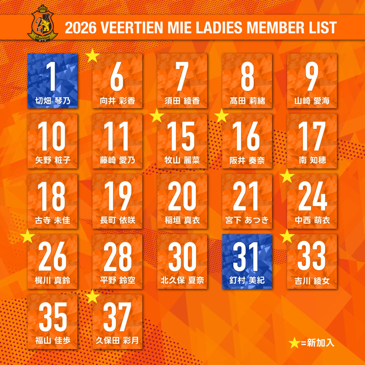 【お知らせ】2026シーズン 選手背番号 2026-01-31 2026シーズンの選手背番号が決まりましたので、お知らせいたします。🔶GK1.切畑琴乃31.釘村美紀🔶DF8.髙田莉緒17.南知穂30.北久保夏奈33吉川絢女🔶MF6.向井彩香7.須田綾香9.山崎愛海10.矢野粧子15牧山麗菜16阪井奏奈19.長町依咲24中西萌衣26梶川真鈴28.平野鈴空🔶FW11.藤崎愛乃18.古寺未佳20.稲垣真衣21.宮下あつき35.福山佳歩37久保田彩月※青文字は新加入選手(1/31現在の選手です。入団があった場合には随時更新いたします。)🔶監督貞清健一🔶コーチ鵜飼和裕
