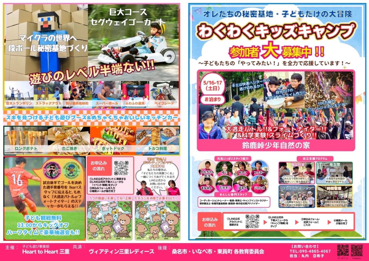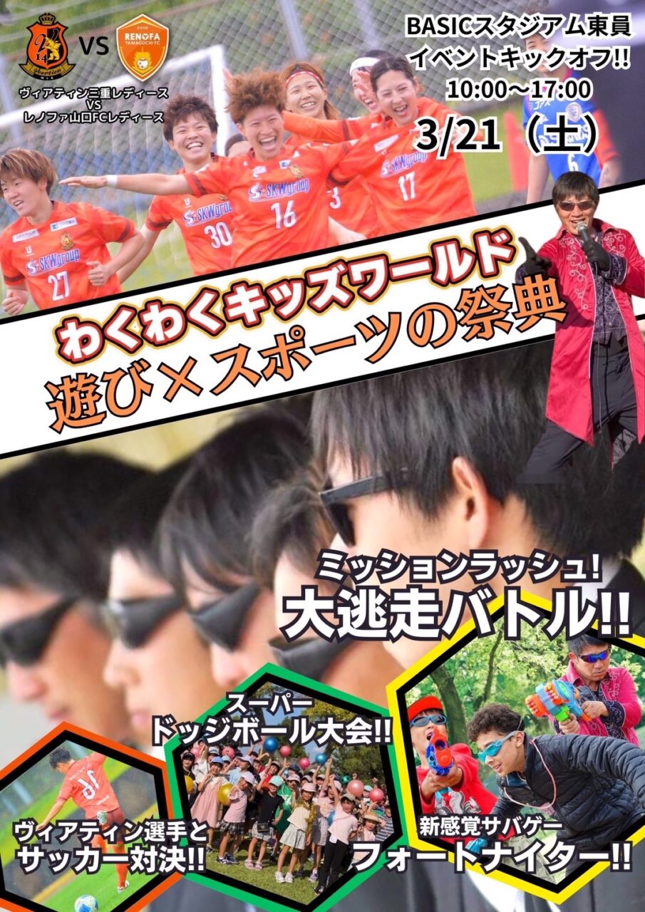 女子選手とサッカー対決、トランポリンやゴーカート、ふわふわ遊具でも遊べます。是非、お越しください。