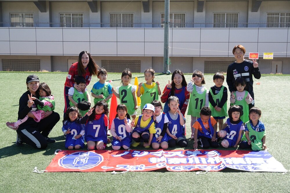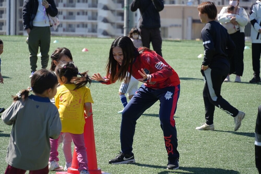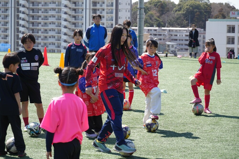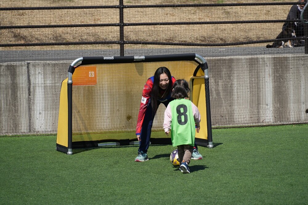 3月15日(日)、コーポレートパートナーの「スカイグリーンパーク・大坂台公園」さまとの共催にて、サッカー教室を実施!平田ひかり選手と木竜有姫選手が参加し、未就学児クラスと小学生クラスの2部構成で45名の子どもたちとサッカーを通じて交流を深めました。
