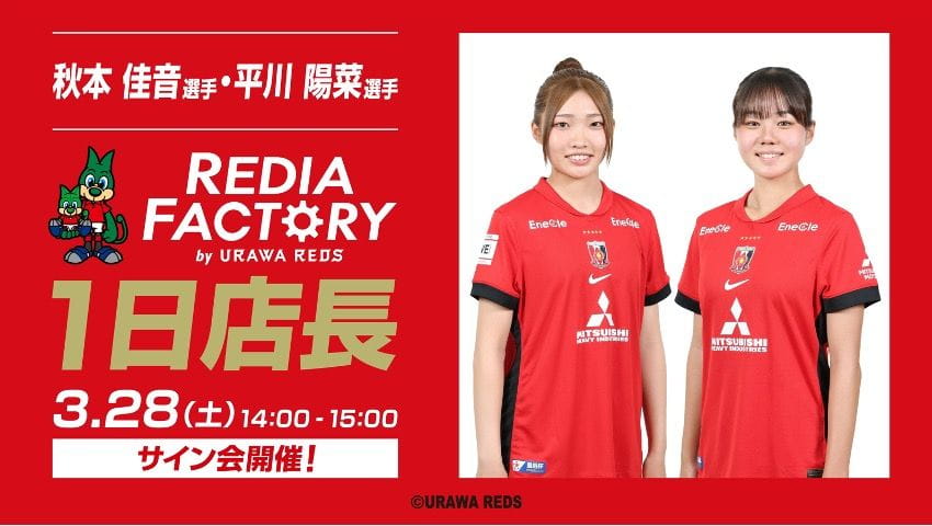 3月28日(土)にイオンモール浦和美園にある「REDIA FACTORY(レディアファクトリー)」にて、秋本佳音選手、平川陽菜選手による1日店長イベントを開催いたします!