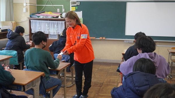 また、校庭で体育の授業中に楽しそうにサッカーをする3・4年生の姿を見て、「私たちもパワーをもらえました。スタジアムで私たちの試合を見てもらえたら、サッカーの楽しさをもっとわかってもらえるはず」と、地域の子どもたちへ期待を寄せていました。